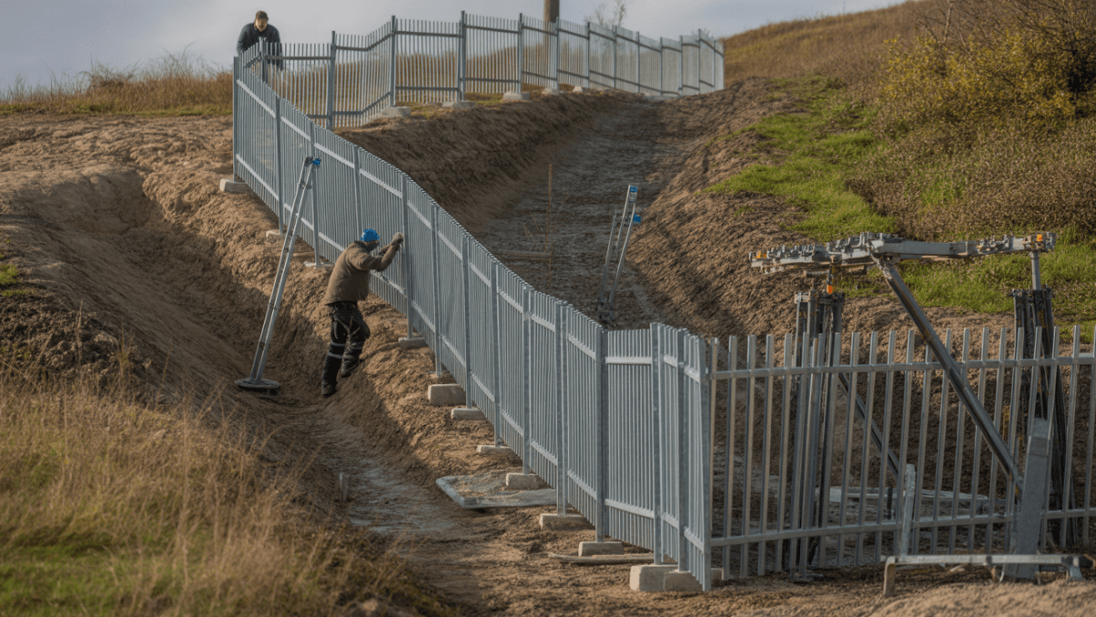 Расстояние между столбами пришлось варьировать: на ровных участках 2,5 метра, на склоне — до 2 метров для жёсткости.